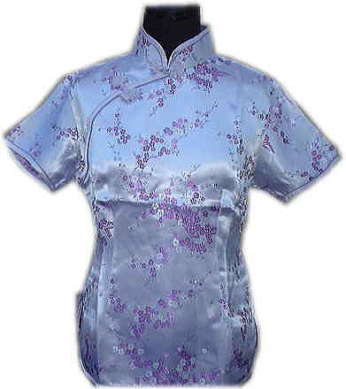 チャイナ・ブラウス 「斜襟 銀地・紫梅柄」 サテンシルク