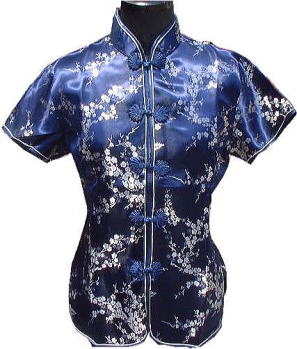チャイナ・ブラウス 「対襟 藍地・銀梅柄」 サテンシルク