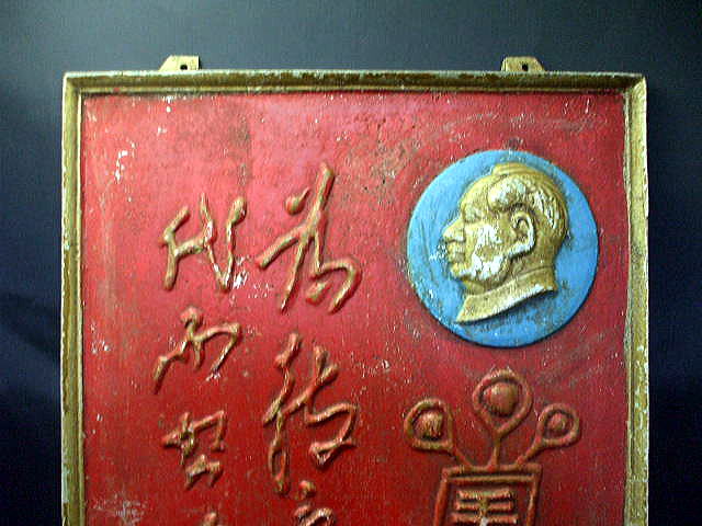 ★これらの牌子(パイズ)は25年前に買い付けにいった時見つけた。すでに北京や上海の骨董市場には面白い物はあまりなく、ある中都市を歩いていたとき、収破爛的人(ショウポウランダレン)「廃品回収業者」と知り合いになった。その時倉庫に行って、手に入れたのが8枚のこの毛沢東宣伝牌子である。材質は毛沢東の大躍進、人民公社の時代で、鍋、釜を持ち寄って、素人が作った溶鉱炉で作った金属のため屑鉄、この牌子もいい例、表面に 為教育新後代而努力は 毛沢東の字。得難い品