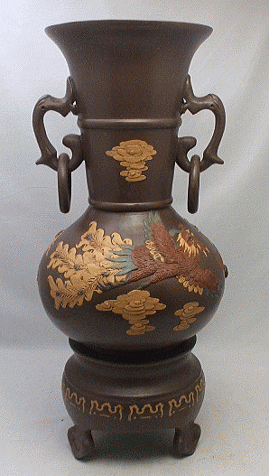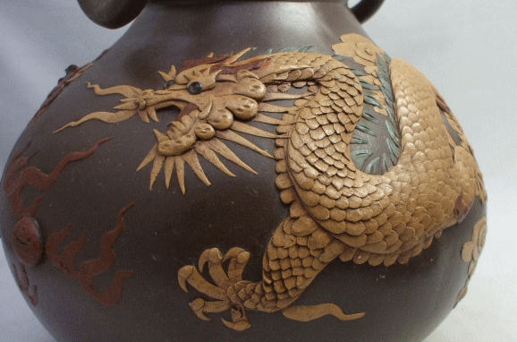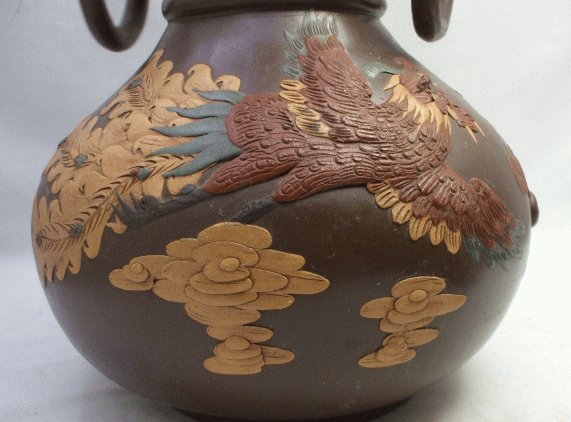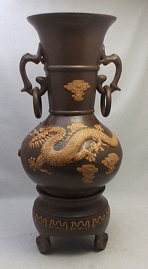 品番:NEW-13 品名:紫砂双耳花瓶「龍・鳳凰」 サイズ:花瓶:横幅22cm 口径18.5cm 高さ37cm 台径16cm 高さ14.5cm 花瓶重さ:3000g 台重さ1200g 価格:1.5000「税込」 現品限 中国・宜興製 作者:丁少杰----中国工芸美術大師 ★耳環は動きます 裏:丁少杰製