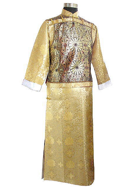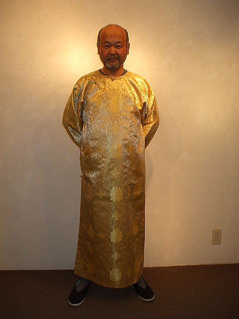 ※この長袍には襟がなく、馬褂自体に付いています。着るのには、女性のブラウス斜襟のように片側のボタンをはずし着ます