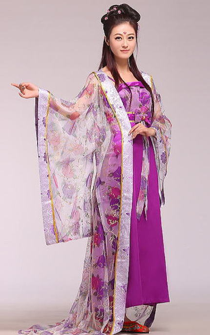 隋唐の時代からは服飾の制度が一段と整い、色も文様も多種多彩になった。 男の服装は長い衫を尊んだ。衫はゆったりした大袖(袖口が大きく、