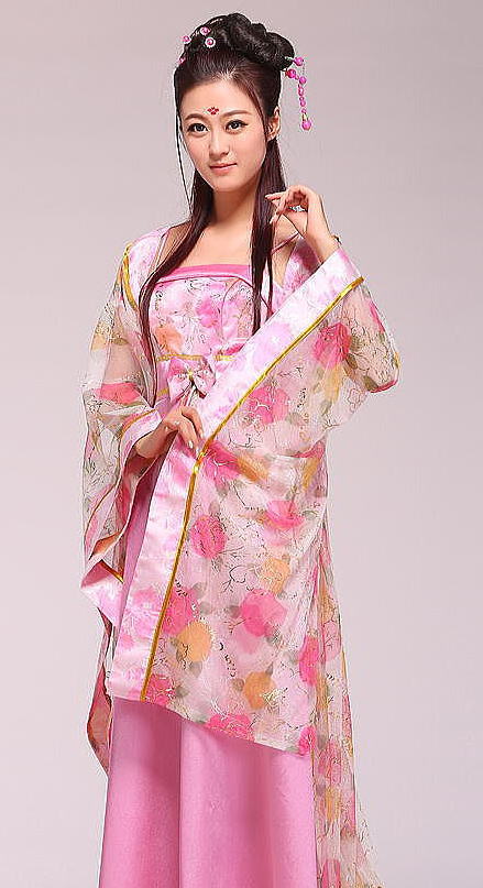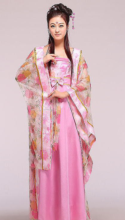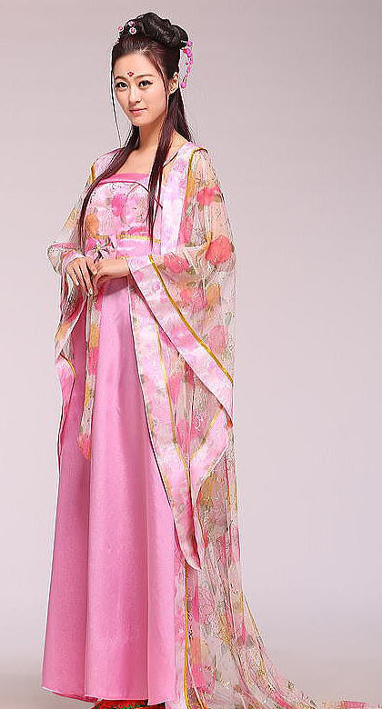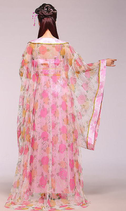 隋唐の時代からは服飾の制度が一段と整い、色も文様も多種多彩になった。 男の服装は長い衫を尊んだ。衫はゆったりした大袖(袖口が大きく、