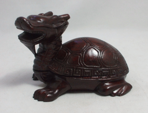 品名:木彫:龍・亀 品番:D-18 サイズ:高さ:8cm 横14cm 奥10cm 内径4.5x7.5p 重さ:193g 材質:黒壇 価格:¥3.980「税込」現品限り 中国・江蘇省 ★龍亀はその名の通り龍の頭を持つかめです。 麒麟や龍と同じように想像上の生物で、中国では護国の瑞獣として古来より崇められきました。 この龍・亀は置物やこ香盒にも使えます。