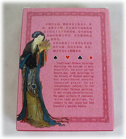 中国トランプ 中国古代仕女 品名:中国古代仕女 品番:TORA-27 8.8cmx6.3cm「トランプのサイズ」 9.5cmx7.3cm「箱のサイズです」 価格:¥980「税込」 在4 中国仕女とは我々が一般に考える、召使や女中とは違い、紳士淑女の淑女が当てはまるかも知れない。 皇族、貴族らの後宮に仕える女官の事で、女官でもかなりの階級格差がある。 私が個人的に好きな、悲劇の王昭君や、唐代に女帝に登りつめた、武氏(武則天)なども仕女。
