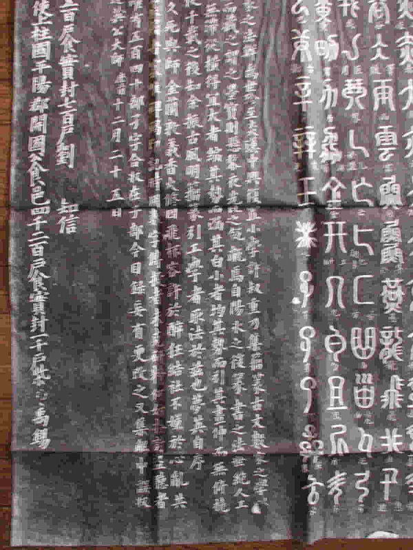 篆書の本文は、直線・曲線ともに、すべて2mm ほどの幅の線で、同じ筆圧で書かれていて、単調で古くさく感じます。しかしその線は明るく洗練されて、文字の背後にある学問への厳しさがうかがえます。そして全体的には整斉で素朴な感が漂っています。篆書の本文に続く左側1/3 ほどに刻された楷書の自序は、一字一字がやや長めで、均衡構成で刻されています。