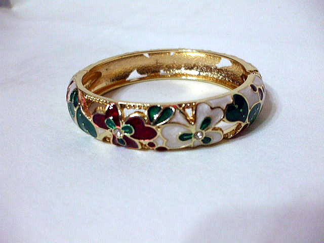 品名:景泰藍(七宝)ブレスレット 品番:AKK-08 サイズ約:外形7.3.cm 内径6cm 重さ39g 価格:¥1200「税込」 在2 ※材質 金属「七宝」 ※このブレスレットは下記の写真のように広げて手首の所から楽に入ります