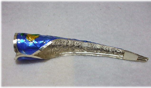 ※ 瓜カバーは指甲套(zhijiatao)と言い、清朝の后妃たちが指に穿めた一種の装飾品です。身を飾るとともに爪を保護するという実用をも兼ねていました。指甲套の材質は色々あり、金,銀,金メッキ,七宝,宝石などがあります。『詩経』には女性の手について「手は若芽のように柔らかく、肌は白玉のように美しい」という詩旬があり、女性の細い柔らかな指に対する男性の憧れが窺われる。その為に装飾の意味で爪を伸ばす事が流行る。成果でもある。その装飾法の一つが「蓄甲(爪を伸ばすこと)」である。しかし爪は一年で10cm程伸びるのがやっとであり、長い爪は不注意ですぐに折れてしまうため、「蓄甲」は労働階級の女性たちには手の届かない習慣であり、貴族のみが楽しむことができるおしゃれであった。貴族階級の女性たちはこの長い爪を保護するために爪カバーを爪にかぶせた。