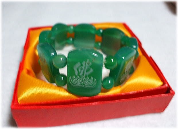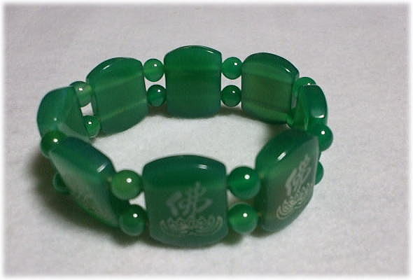 品名:佛字:ブレスレット 品番:AKK-19 サイズ:外形7.5.cm 内径6.3cm 価格:¥1500「税込」 在1 ※材質 人造宝石 ※2x2.3センチ角の中に佛の字 合計8つがゴムで繋がっている、男性でも可能