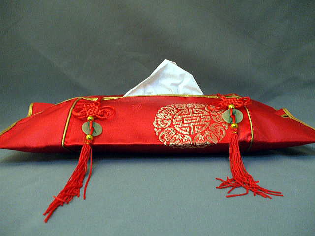 テッシュカバー「中国結び付」 中国雑貨 品名:テッシュカバー 品番:TEE-9 サイズ:36cmX21cm 素材:サテン(裏地有) 価格:¥700(税込) 在庫9 長寿と五福柄 脇に中国結びが2個