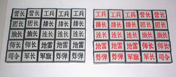 地位が高いいほうから順次、司令、軍長、師長、旅長、団長、連長、排長、工兵。高いものが相手の低いものを取ることができます。同じ地位のコマの場合一緒に基盤からとられます。