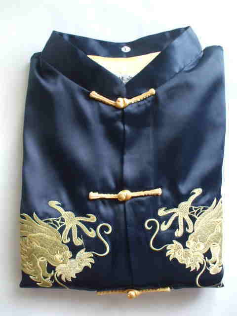 品名: 長袖チャイナ服 [黄金双龍刺繍・黒紺」