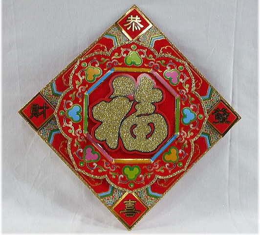 品名:福:恭喜発財 「方聯」 中国伝統雑貨 品番:ME-4 価格:\650「税込」 サイズ:高さ「約」: 33.5cm 幅最大 「約」: 33.5cm 材質:紙 中国製