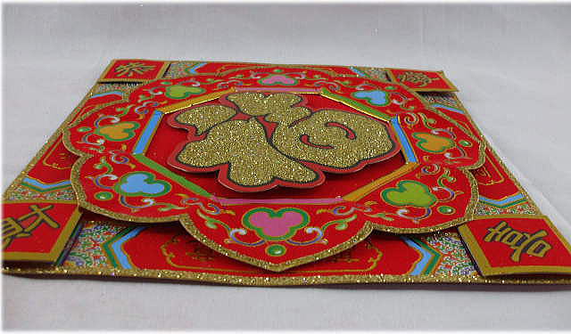 ※中心の福の字は切り抜いた別紙に 文字全体に金粉で装飾し、四隅に切り 抜いた恭喜発財の字と四個のが 貼り付けてある