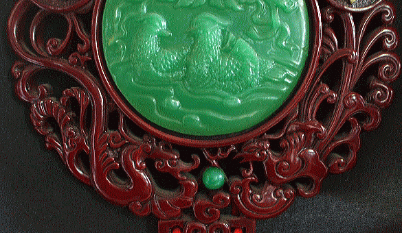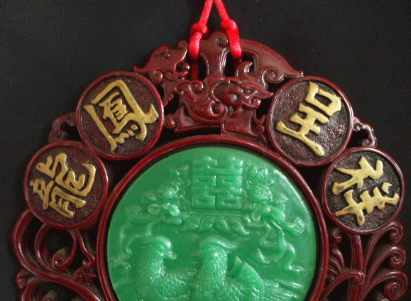 品名: 十二方位牌「龍鳳呈祥」 品番:FU-13 サイズ:径23cm 長さ86cm「掛ける とこから房の下まで」 素料:ポリレジン・赤糸」 価格:¥3.000「税込」現品限 一見、木製のようですが、之もポリレジン製で、緑の翡翠のようなポリレジンには、鴛鴦 と 喜びの字