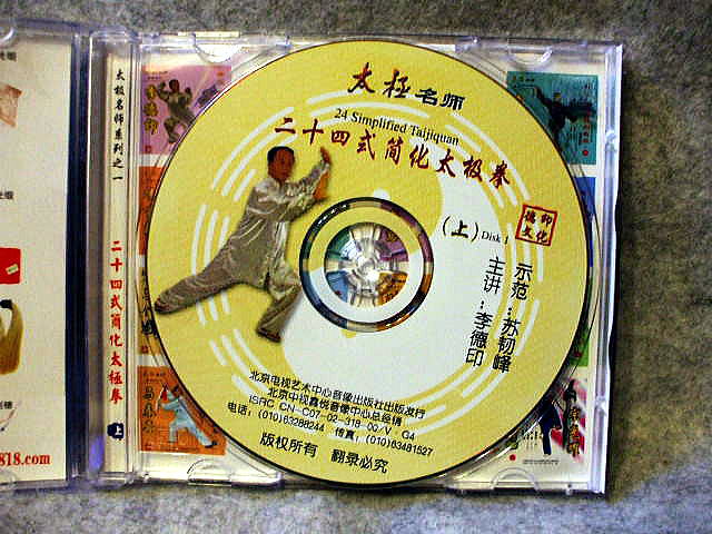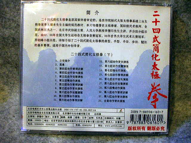 二十四式簡化太極拳は国家体育委員会が選定したもので、伝統的な楊式太極拳をベースに、太極拳家の李天?先生が編み出した模範教材である。このVCDは特に著名な太極拳家であり、国際武術大会の審判員で、北京市武術協会の副主席、人民大学の教授でもある、李徳印先生が、自ら出演、講演し、99年世界大学生武術大会で優勝した、蘇?峰小姐が演舞をしてます。二十四式の太極拳の体型、手型、手法、歩法、腿法などの基本要領を詳しく紹介しています、初心者には最適の教材だと思います。