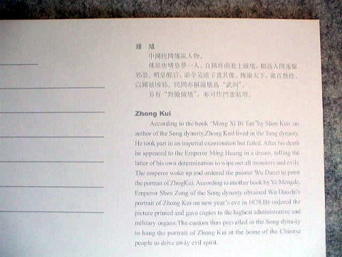 ※数多い年画のなかで、唯一日本に伝来したもの。鐘馗「しょうき}は唐の玄宗皇帝が重病で悪夢に悩まされた時、武人が現れ、玄宗を悩ます鬼を