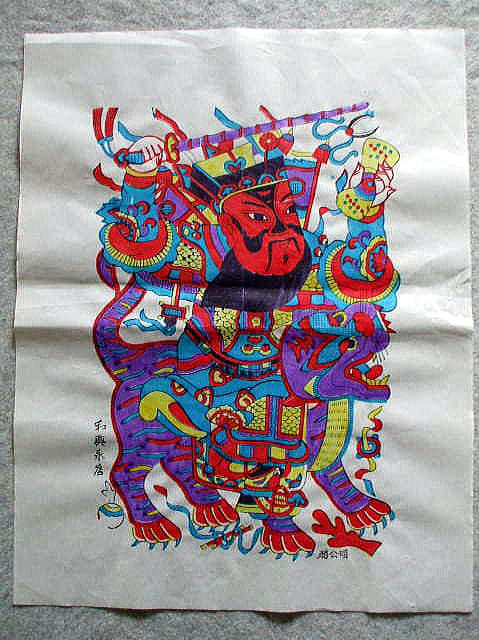 ※武装をし、白い髯で乾坤尺(けんこんしゃく)をふるい、梅花鹿(ばいかろく)にまたがっているのが、NEN-114 の燃燈道人(ねんとうどうじん)で、疾病神として伝染病を広める悪鬼を退治する神である。同様に武装をし黒い髯で鉄鞭をふるい、虎にまたがっているのが、こちらの絵 趙公明で金銭を司る神として、また蓄財に優れていることから福の神といわれ、武財神に加えられ、この二神の神通力をもって家内の安泰を祈った。 別名「虎鹿門神:ころくもんしん」とも言われている。