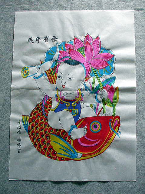※年画の代表にはこの蓮年有余がある。この蓮年有余の絵柄も数知れなくあるが、なぜこの絵が一般大衆に歓迎されたか、、。そもそも中国数千年の封建社会においては「綺羅(きら)の服を着るのは養蚕の人ではなく、指が泥に触れない者は立派な屋敷に住む」ようなことばかりで、労働大衆は「門前の土を焼き物に使い尽くされても、屋根には一片の瓦もない」というありさまで、毎日の生活に焦り、年年余ることなどは過分の望みであり、毎日の食料さえ欠くことがなければ最大の幸せであった。 そのため 「連年有余」の絵は夢があって一般大衆に歓迎された。