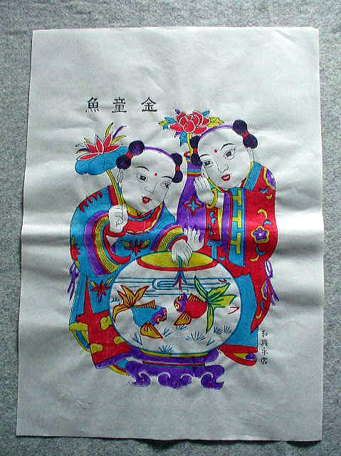 ※この絵は牡丹の花と蓮の花を持った子供が金魚鉢のの金魚と遊んでいる吉祥絵だが、何が吉祥なのかと言うと、 富と地位(富貴)を象徴する牡丹、蓮は連(つながる)と同音、金魚は金余(金が余るの意味)と金玉(金のごとく立派な男の子、玉のような女の子)と同音、金魚鉢=金魚塘(塘は堂と同音 つまり家の広間と同音で通じ、吉祥とされる。 従って金魚を入れた鉢は二重三重の意味で縁起が良く、家庭円満、子孫繁栄、招財福寿の願いがこめられている。