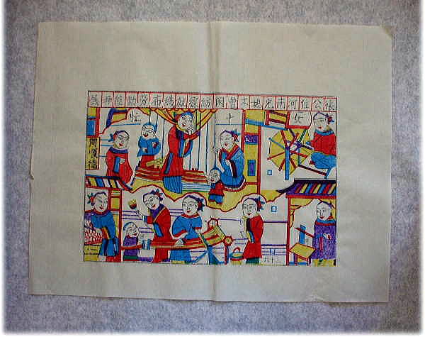 この年画は、中国の女性が日常、屋内外で仕事している姿を良く表している。 綿を弾き、糸をつむぎ、紗を干し、布に織るなど、十種類以上の働く様子が描かれている。河南の女性が織物で稼いでいる場面、今も昔も河南の女性は男性より稼いでいるようです。