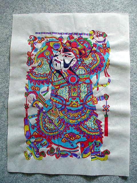 ※この武門神は二武将とも実在人物で、唐代の太宗「626-649」の忠臣の秦叔宝「しんしゅくほう」と尉遅敬徳「うっちけいとく」がその人である。この二武将は「西遊記」にもでてくる。その内容は、経河にすむ竜王が、玉皇大帝に背いたため大帝の命を受けた唐の太宗によって殺された。竜王は太宗を怨み夜ごと太宗の夢枕にたって悩ませたので、太宗の命が危うくなり、この二武将を門の警備に立てたところ、竜王の怨霊は現れなくなった。それ以来この二武将の画像を年画にして門扉に貼って悪霊払いとした。 武門神の傑作といわれる。