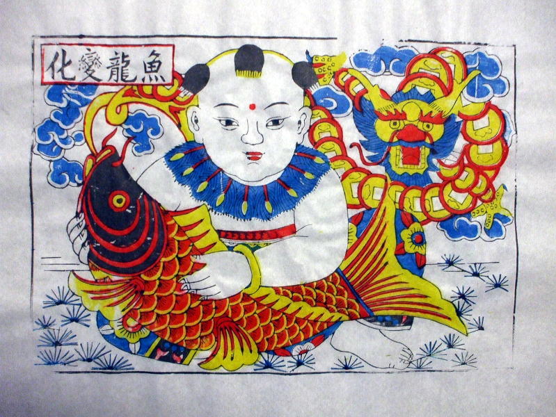 着飾った子供が大きな鯉を抱き、その鯉の口からは瑞雲がたなびいて、天空に向かって虹を吹き出し、天には龍が顔を出している。「説文解字」では、龍は鱗のある動物の長とされ、鯉は川を遡り、滝を登り龍門を跳ね上がり龍となる出世魚と見られる事から、子供の出世を期待し願う年画である。