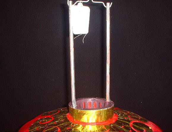 ※ この紅灯は竹と鉄で出来ていて、丁度、傘を開くように、上から押さえるようにして開きます。かなりきついです。この代表の物が、天安門に架かっています。21世紀になった時、新しい物と交換する時、古いものを北京でオークションに賭けた事が有ります、なんとその古いものが、5万元(日本円75万)で落札されました。どんな物好きの人かたずねたら、やはり中国の解放政策の波に乗った、金持ちらしかったです。その後、あんなにばかでかい紅灯を何処に吊るしたのか、さだかではありません。 もちろん電灯は入ります