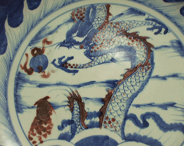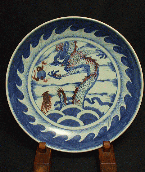 青花釉裏紅海龍盤 中国陶磁器 ★古物ですので、ホツ・ソゲ・スリキズがあります、ご了解ください