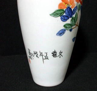 品名:花卉文長頸薄胎瓶(椿) 品番:AC-13 サイズ:高26cm 最大径8cm 重135g(平均) 価格:¥5.000 「税.込」 中国・景徳鎮製 ★ 景徳鎮にて丁丑の年製作とあり、となると一番近い年は 1997年 その前は1937年(この年は日中戦争の時代だからね、、