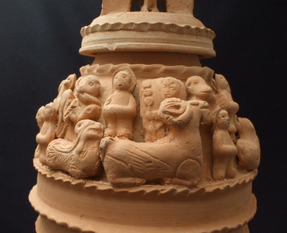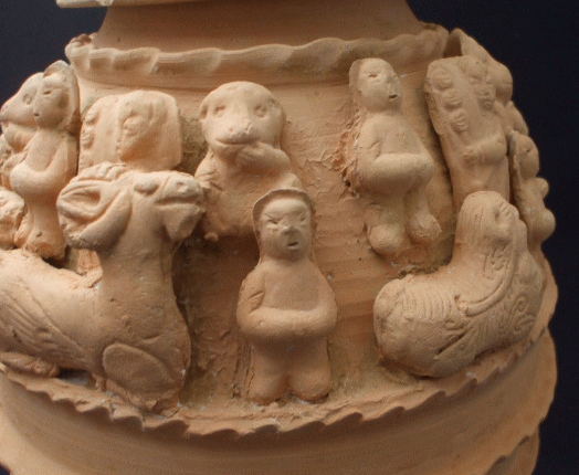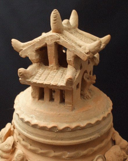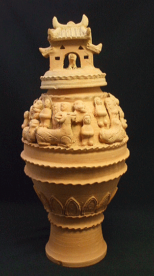 品名:楼閣人物畜生罐 品番:SONー4 サイズ:径18cm 内口径6.5cm 高さ41cm 底経12cm 重2600g 価格:5.000(税込)現品限り 材質:土器 産地:中国陜西省 壺の蓋には小さな家、壺の上には人間、豚、馬、羊犬がひしめいている。粘土製の罐は、副葬品の一部として作られた物です。 蓋に少し欠け処はあります。 壺の下に少し欠け処はあります。